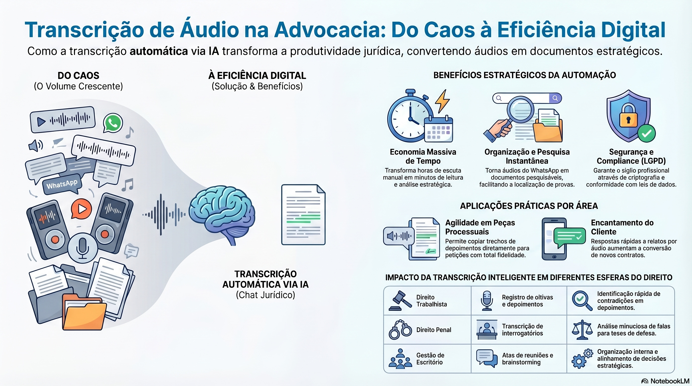 | Transcrição Inteligente | Converte áudios de diversas fontes (WhatsApp, reuniões, audiências) em texto com alta precisão. | Garante que nenhuma informação falada seja perdida, transformando-a em um registro formal. |